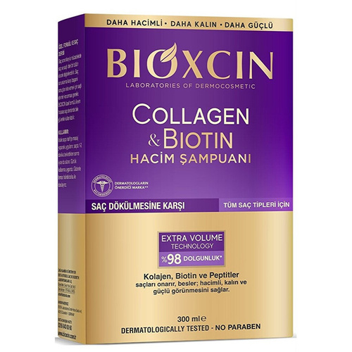 شامپو بیوکسین ضد ریزش حاوی بیوتین و کلاژن حجم 300 میل محصولی از شرکت بیوکسین BIOXCIN ترکیه است . شامپو bioxcin گیاهی ضدریزش ترمیم کننده با فرمولاسیون قدرتمند و با بهره گیری از عصاره های کاملا طبیعی و انواع ویتامین ها و مواد معدنی برای کنترل ریزش مو طراحی شده است . شامپو حجم دهنده کلاژن و بیوتین بیوکسین برای موهای نازک و ضعیف بسیار مناسب می باشد . شامپوی ضد ریزش قدرتمند بیوکسین، حاوی کلاژن هیدرولیز شده،بیوتین و پپتیدهای فعال زیستی فعال می باشد که باعث تقویت ساختار مو می باشد. وچود بیوکمپلکس B11 در ترکیبات این شامپوی بیوکسین از ریزش مو جلوگیری می کند. عدم وجود پارابن و مواد عطری و حساسیت زا در ترکیبات شامپو کلاژن بیوکسین، این شامپو را برای انواع مو و بویژه موهای حساس بسیار مناسب می باشد .